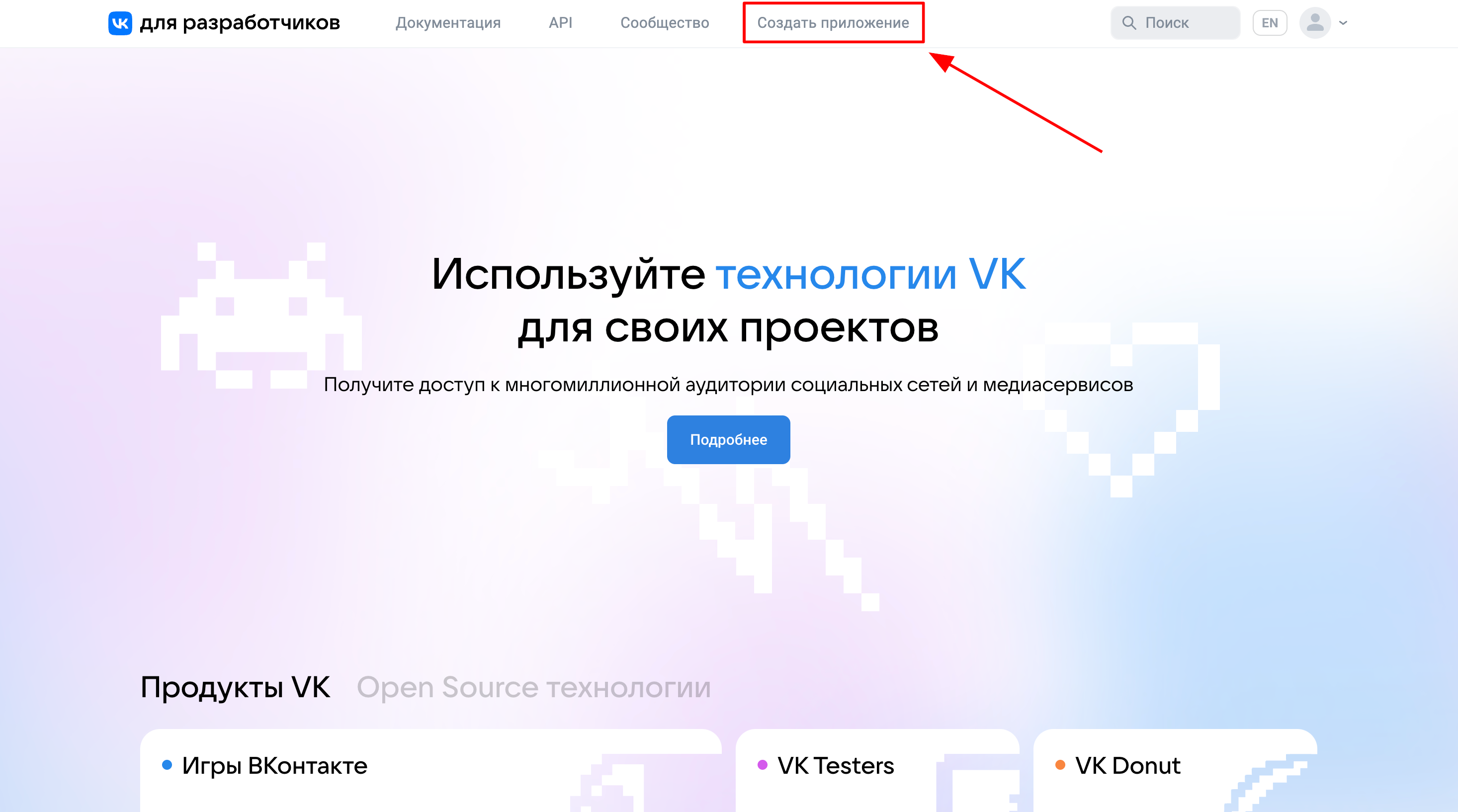 1. Переходим на страницу https://dev.vk.com/ и нажимаем кнопку «Создать приложение»: