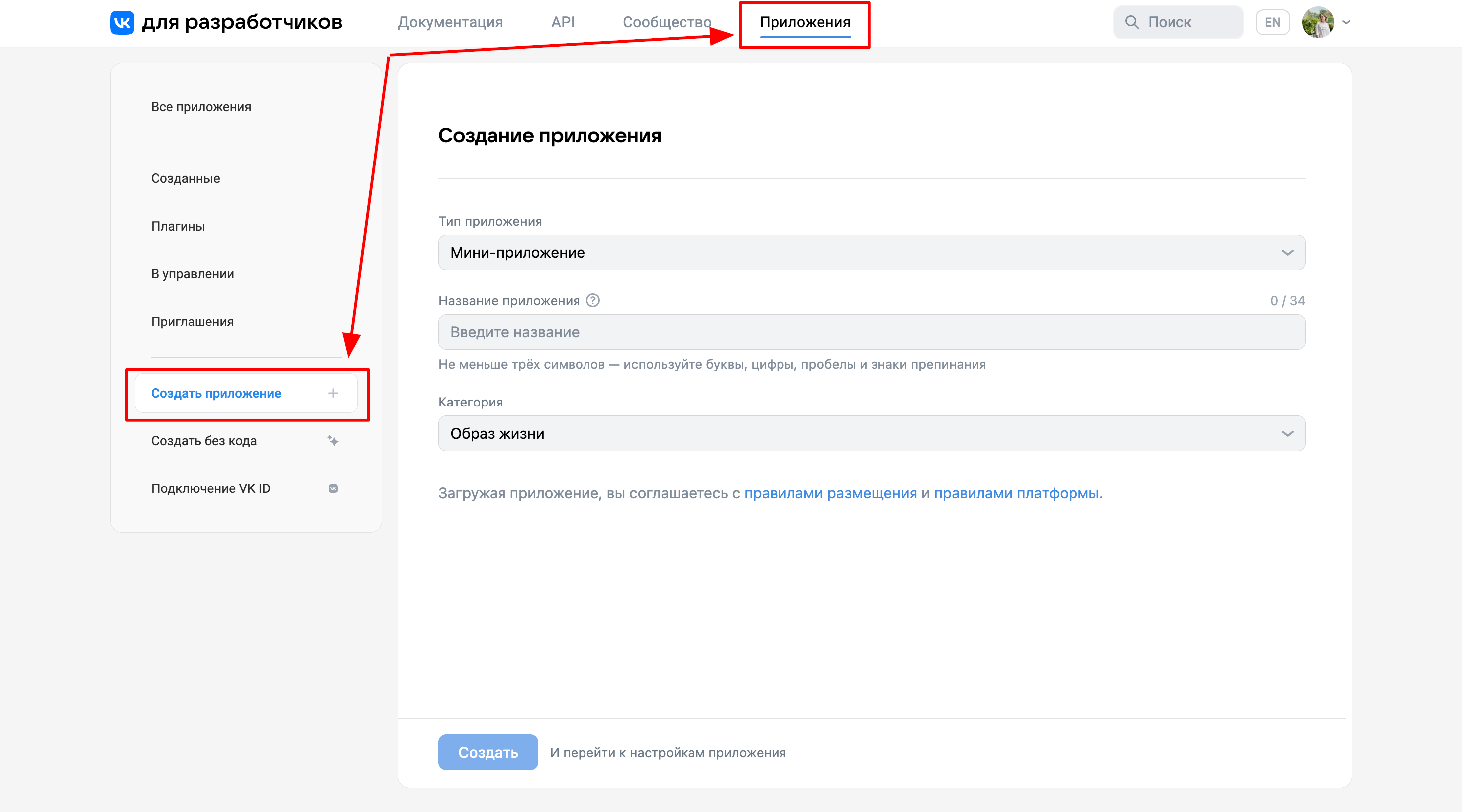 2. Выбираем раздел «Прилоения» и «Создать приложение»:
