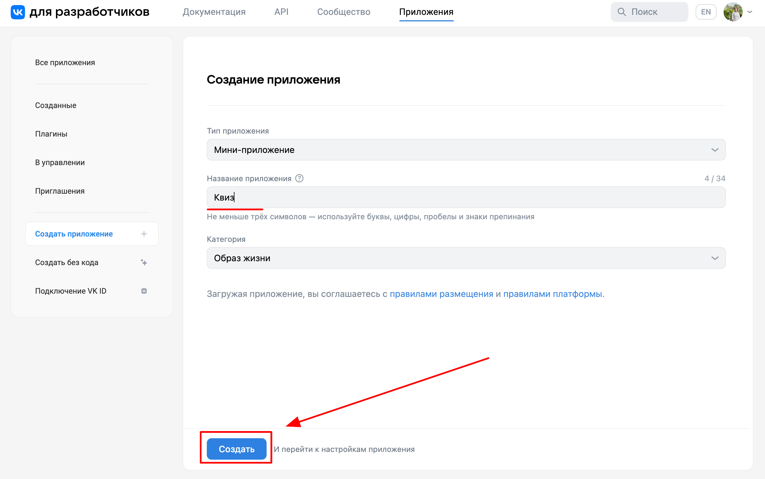 Пишем название приложения и нажимаем кнопку «Создать»: