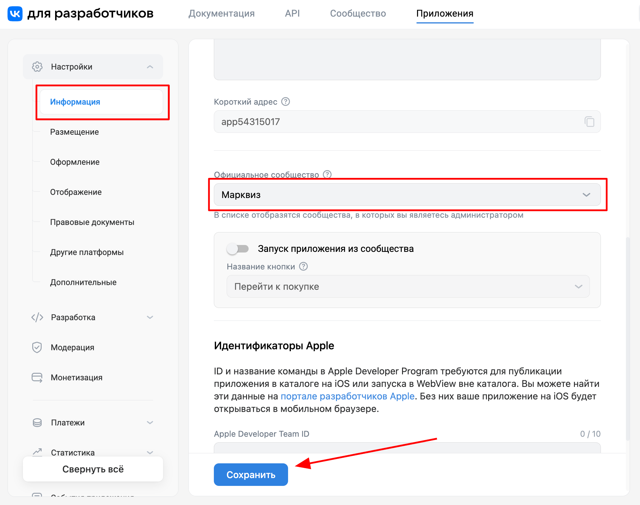 3. После создания приложения, автоматически откроется раздел «Информация», здесь нужно указать сообщество, в котором вы хотите разместить квиз: