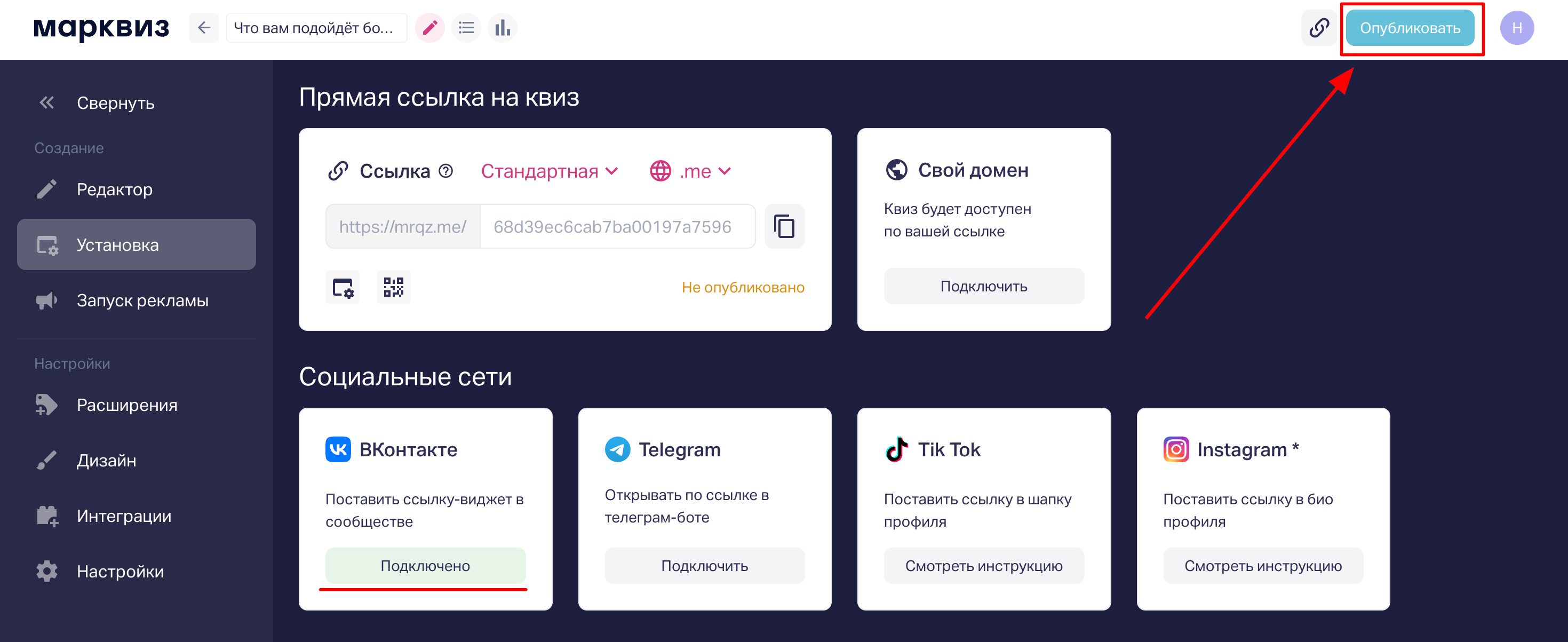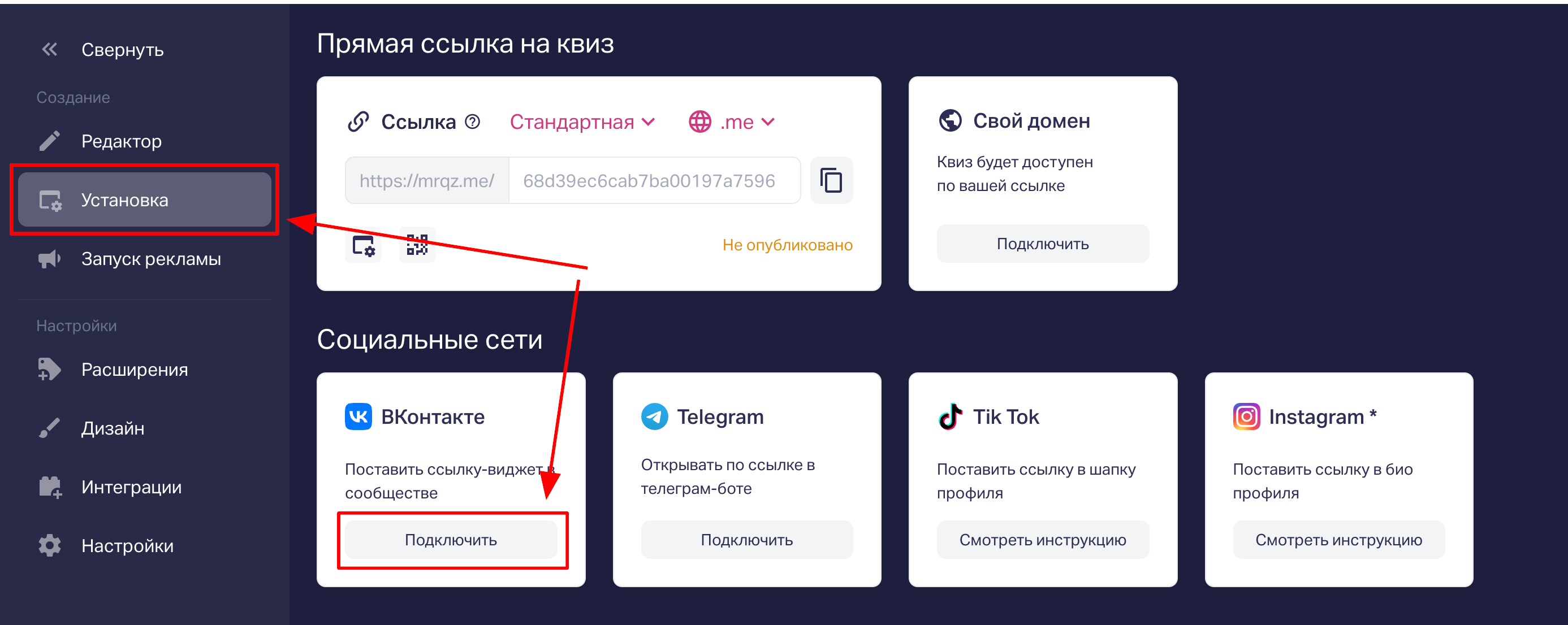 Чтобы ее получить, открываем редактор квиза (https://panel.marquiz.ru/quizzes => Кнопка «Редактировать» у нужного квиза), далее переходим на вкладку «Установка» => «ВКонтакте» => нажимаем на кнопку «Подключить»: