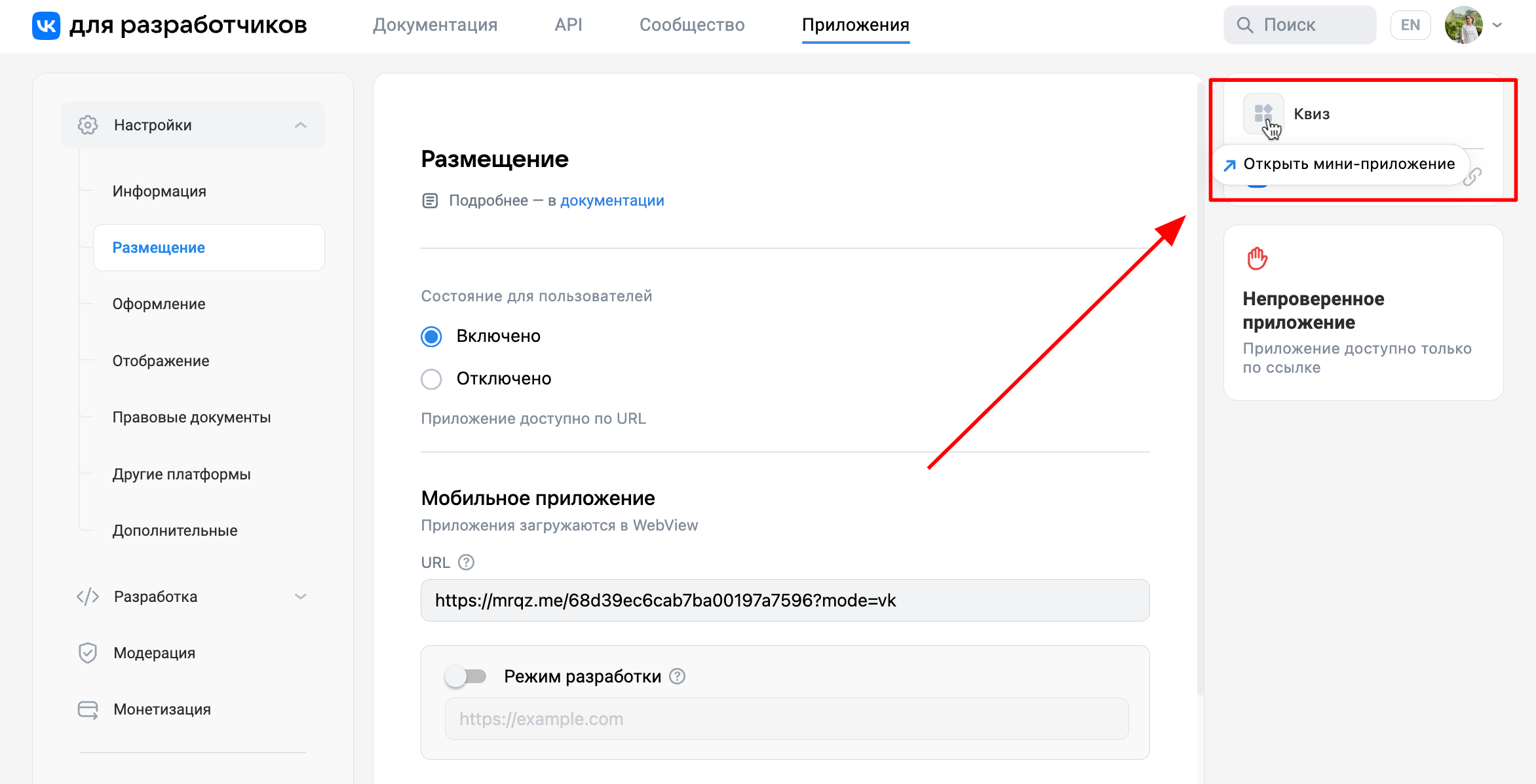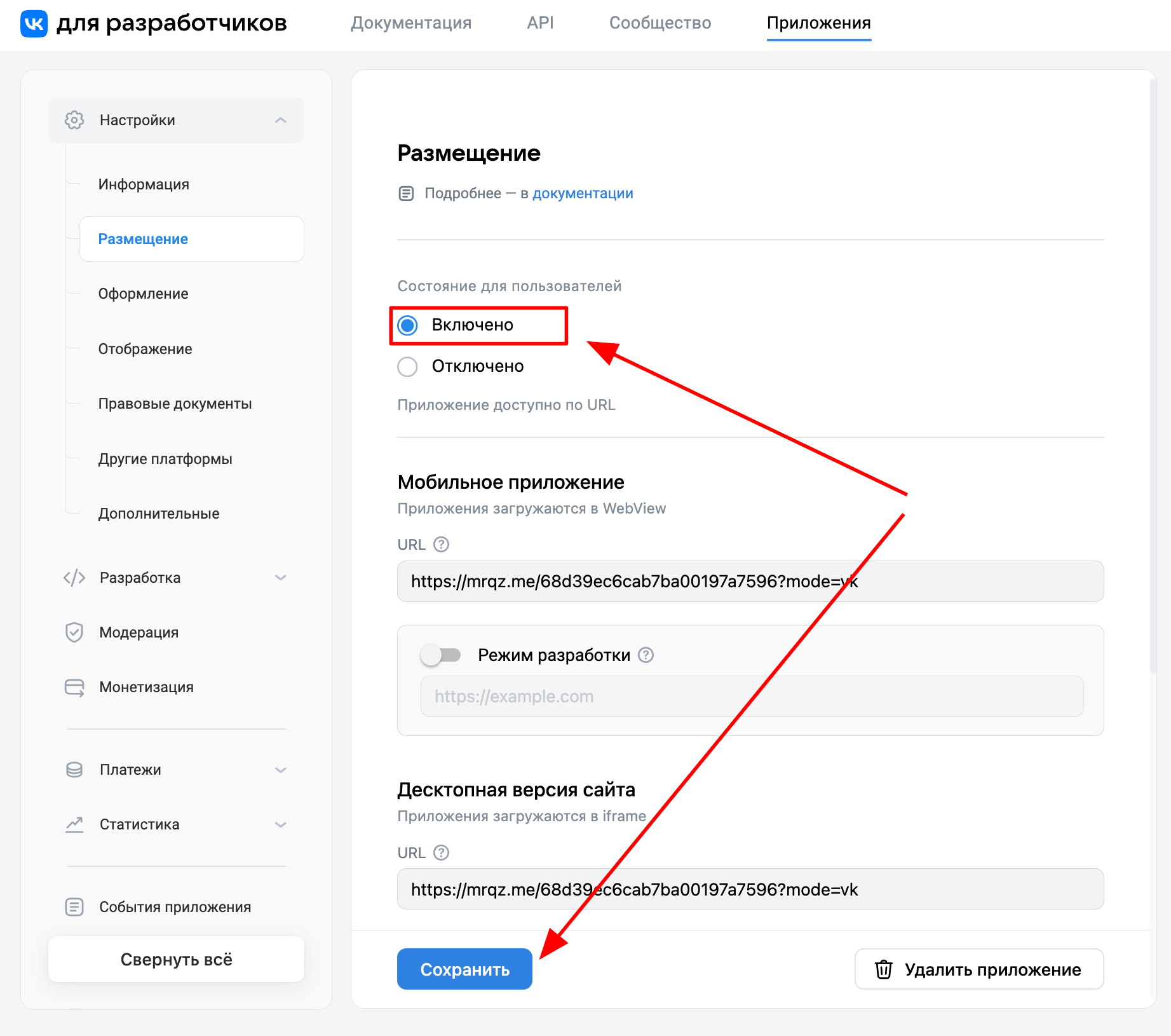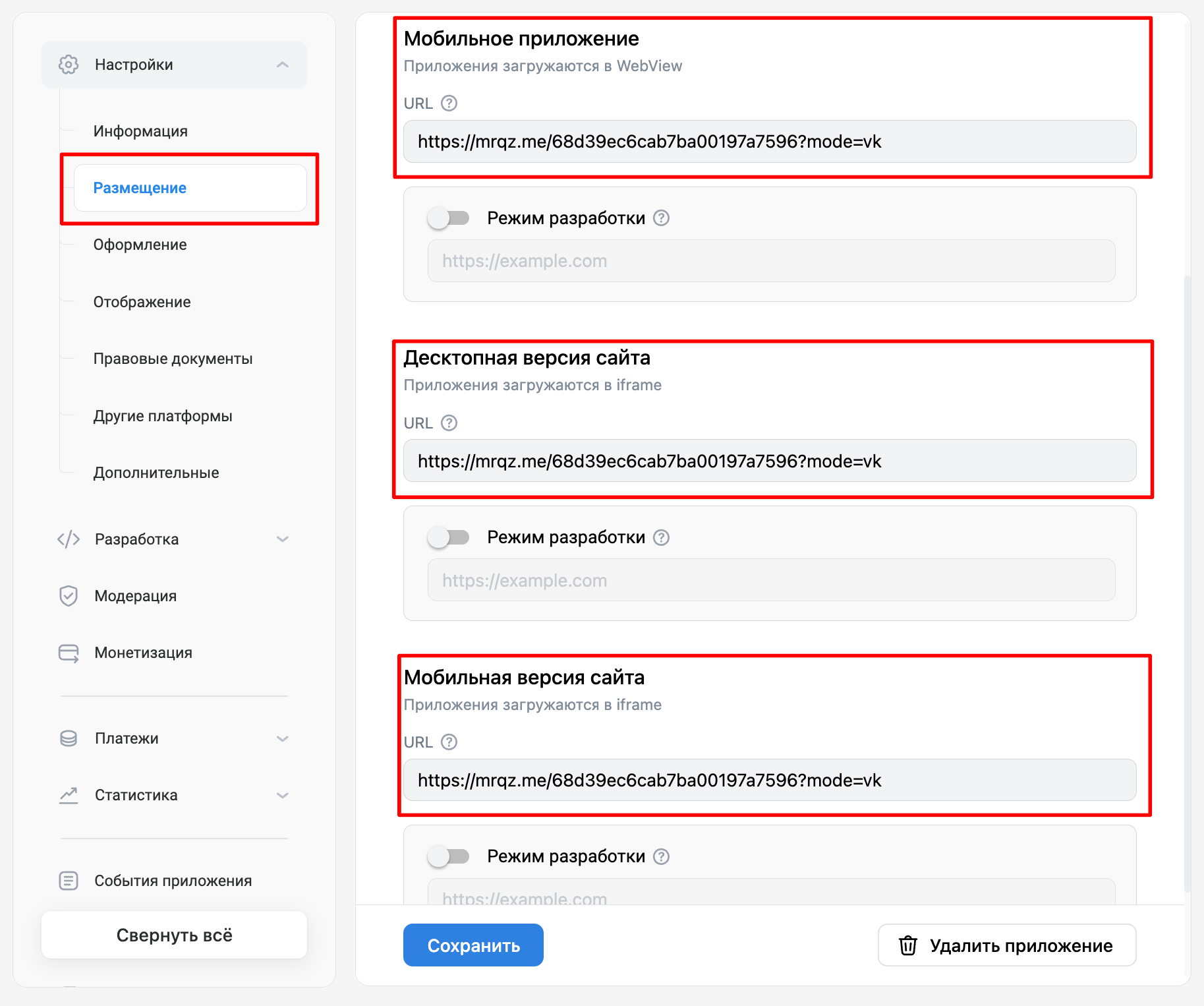 5. Переходим в раздел «Размещение» приложения в ВКонтакте и вставляем в поля с URL (Версия для мобильного приложения, для десктопной версии сайта, для мобильной версии сайта) прямую ссылку на ваш квиз:
