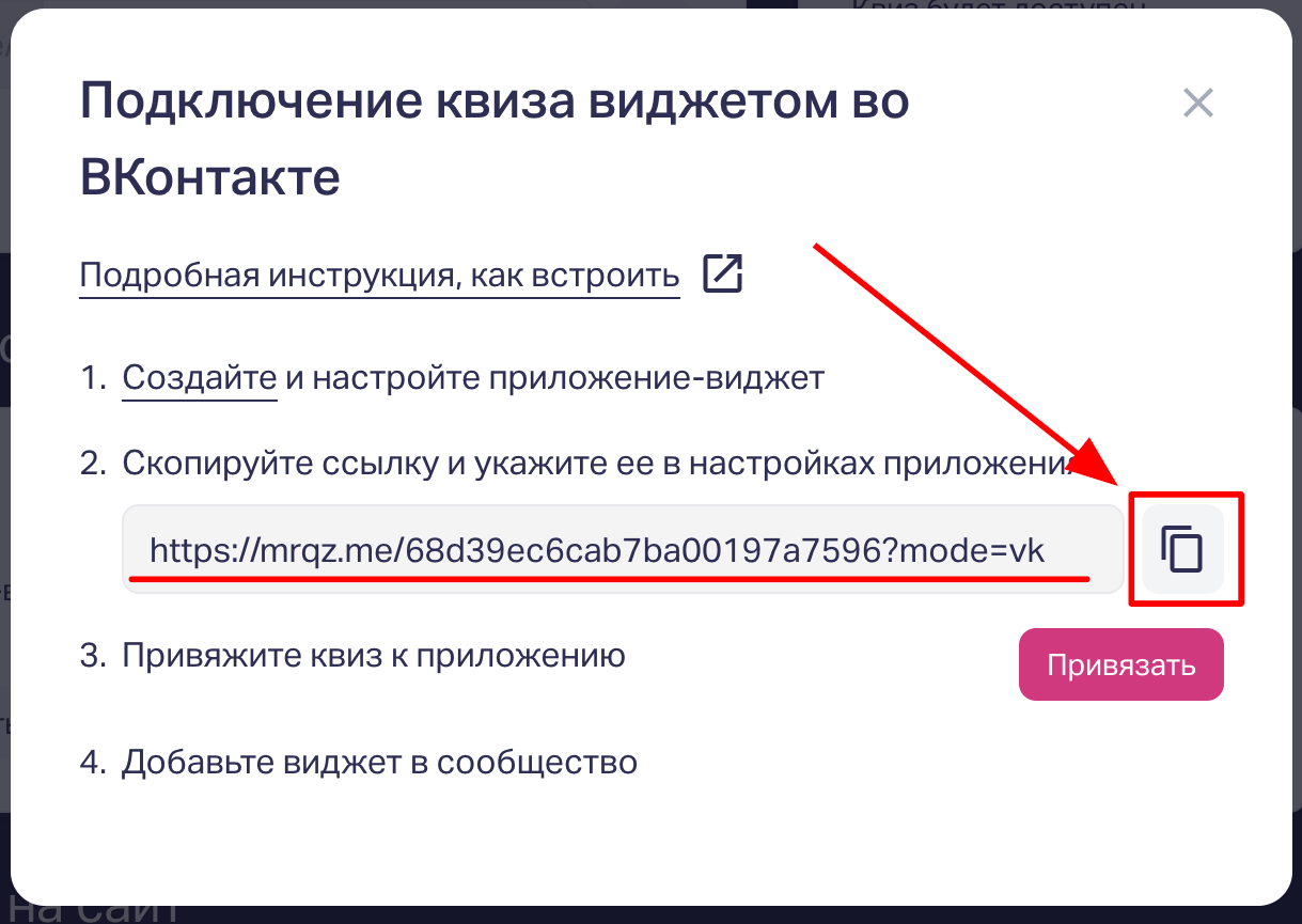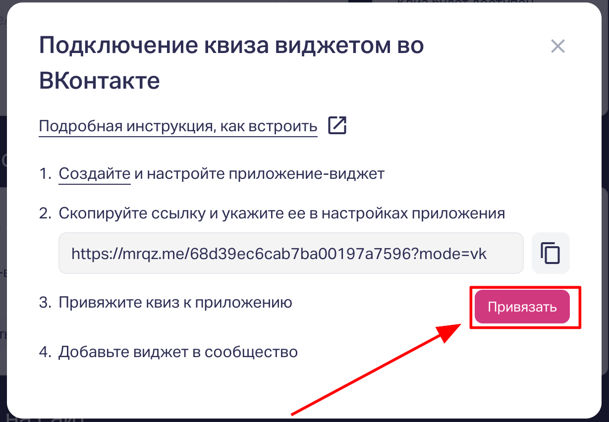 7. Возвращаемся в редактор квиза и нажимаем кнопку «Привязать».