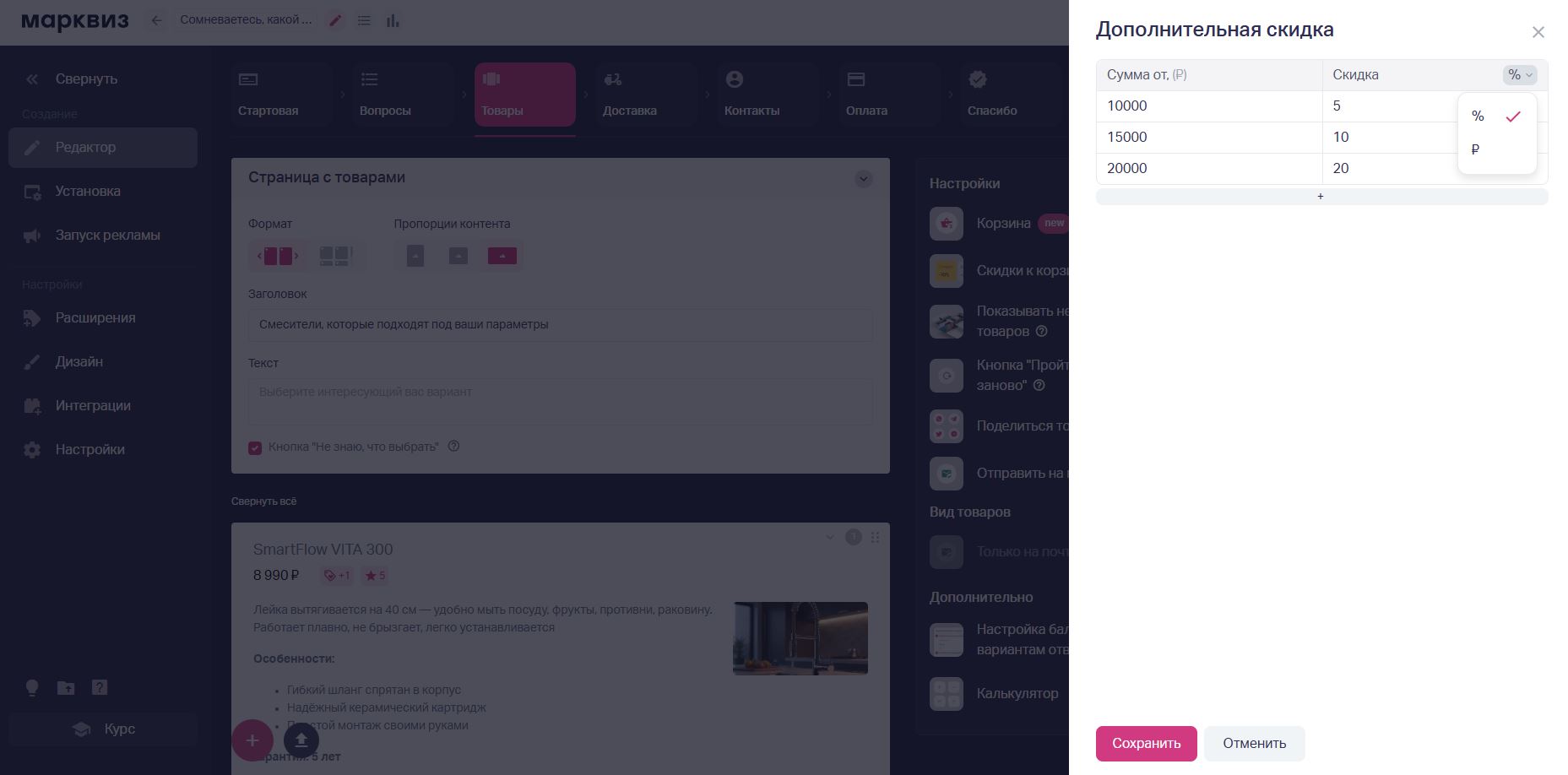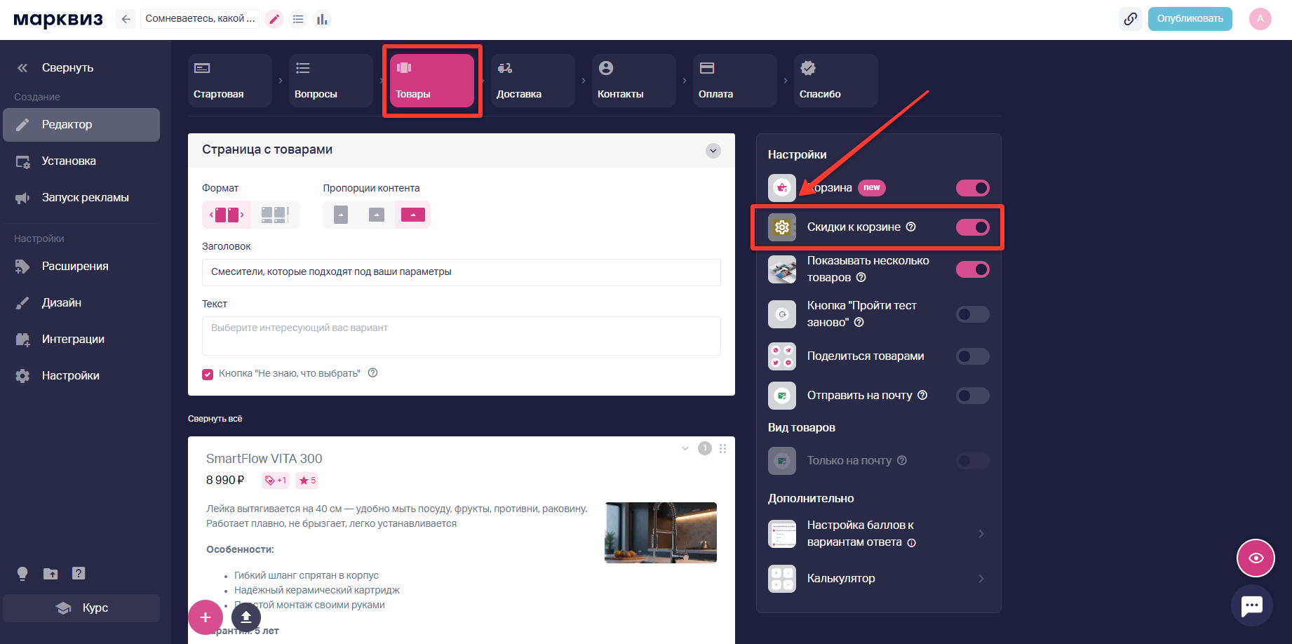 В настройках квиза с активированной «Корзиной» появится новый блок «Скидки к корзине».