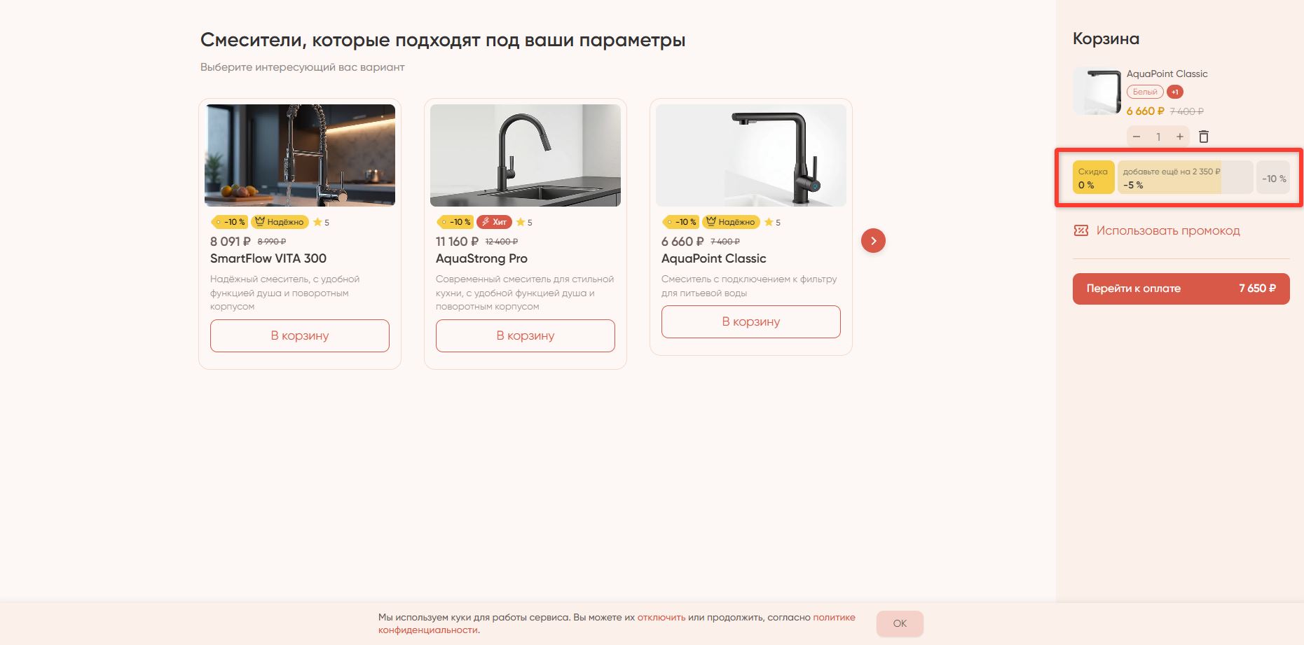 Пользователи смогут применить промокод непосредственно в корзине во время прохождения квиза. Введённый код автоматически пересчитает итоговую сумму с учётом скидки.