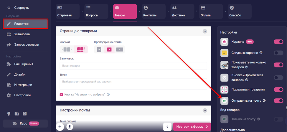 Вывод конкретного товара можно также настроить с помощью баллов — как настроить подсчёт баллов за ответы и показ результатов в зависимости от них, рассказываем в нашей статье.