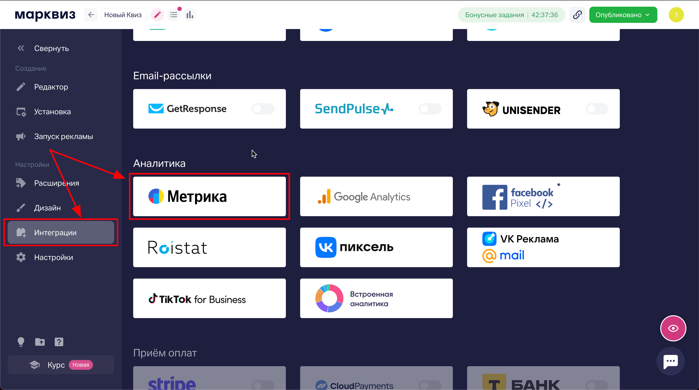 1. Открываем редактор квиза и в разделе Интеграции и выбираем настройку Метрики.