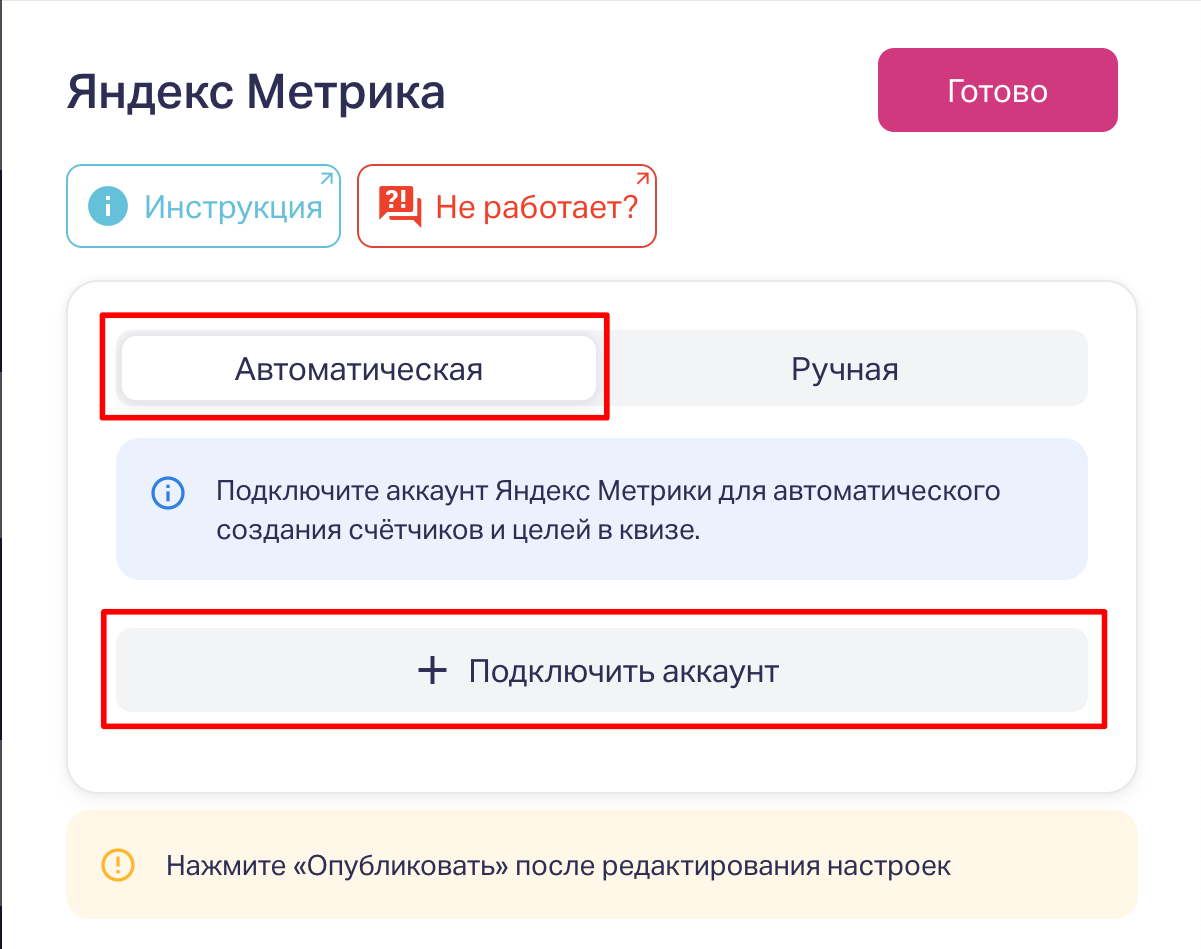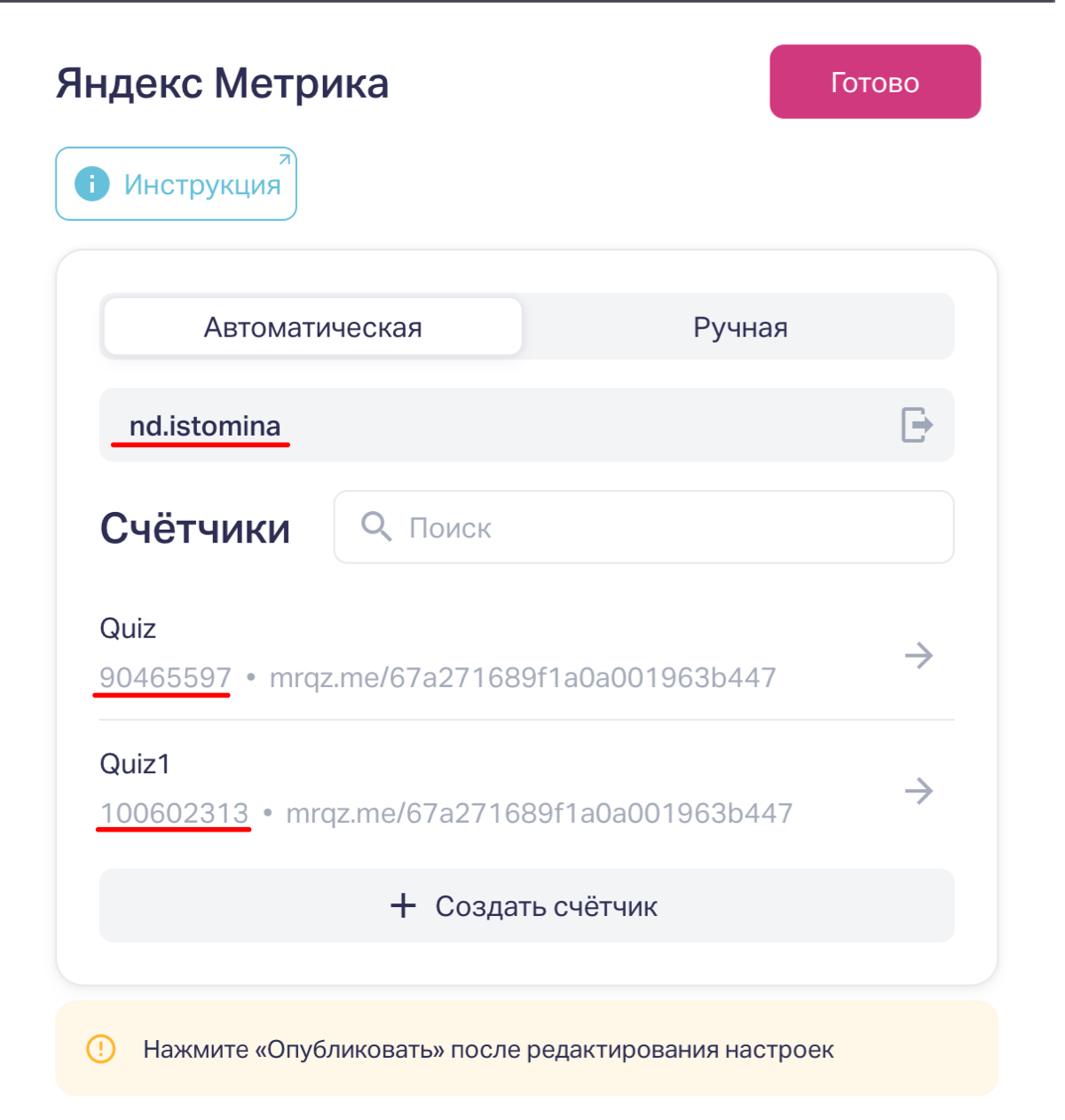 ВАЖНО: После внесения всех изменений нужно нажать кнопку «Опубликовать» в правом верхнем углу экрана, чтобы настройки интеграции квиза и Яндекс Метрики сохранились.