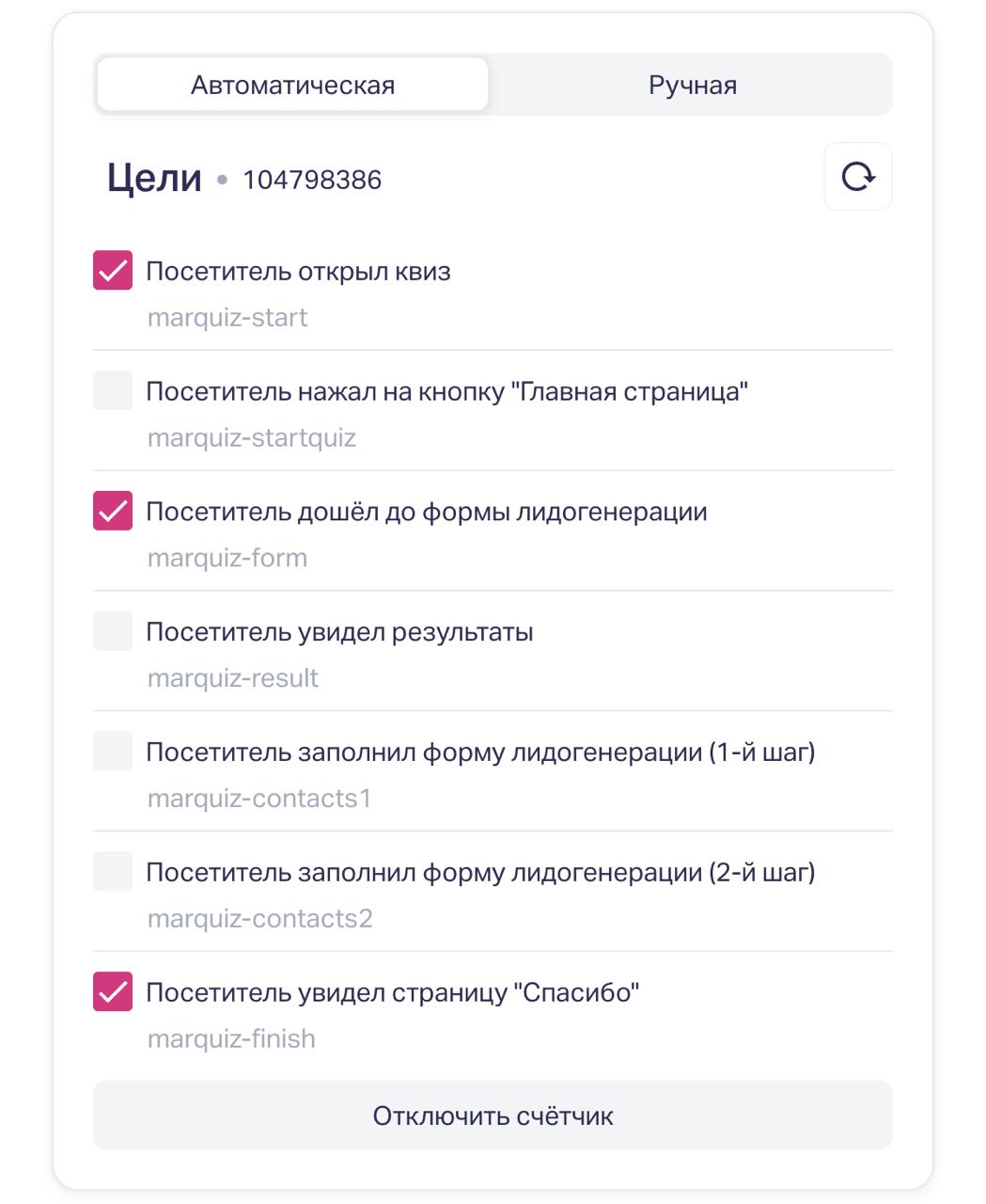 Если вам нужно настроить собственные цели, подключить Вебвизор или убедиться в корректной работе счётчика, воспользуйтесь подробной инструкцией: Как установить Яндекс Метрику в квиз?