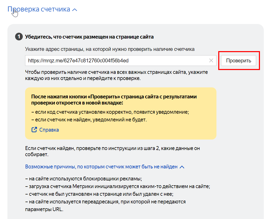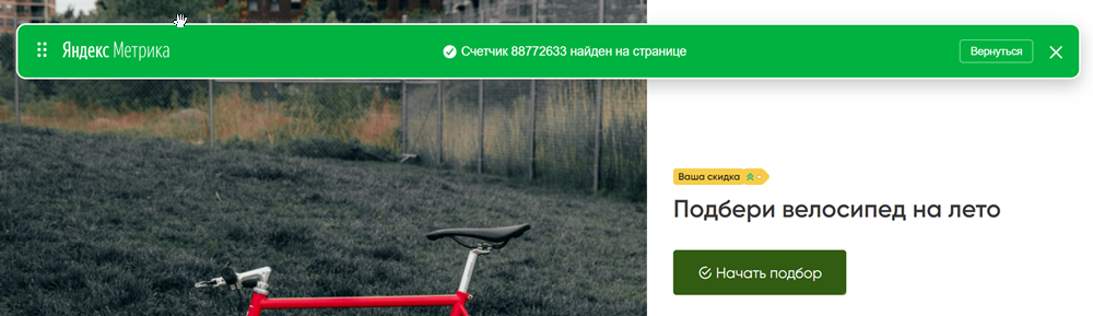 Если всё настроено верно, появится сообщение, что счётчик найден на странице.