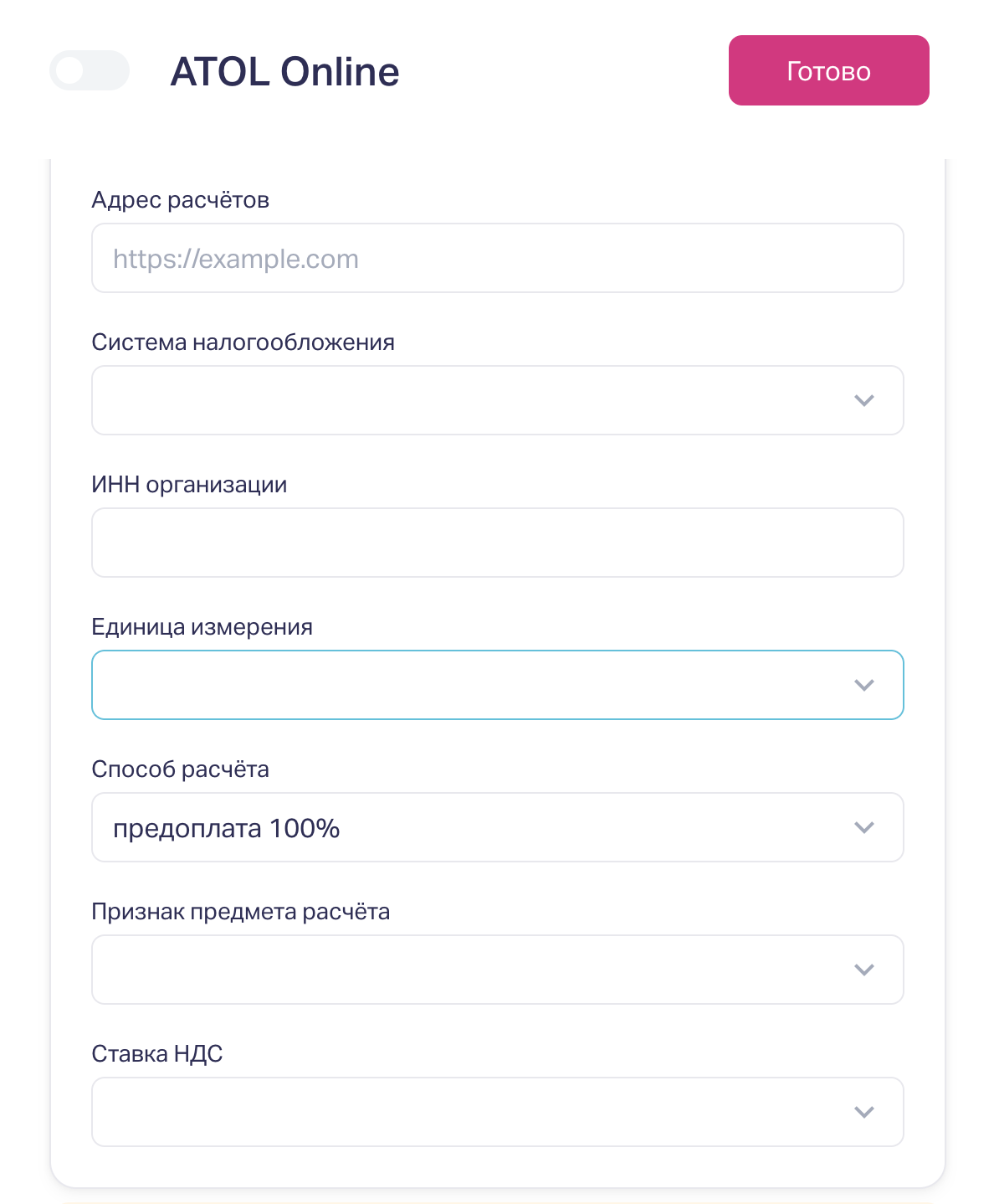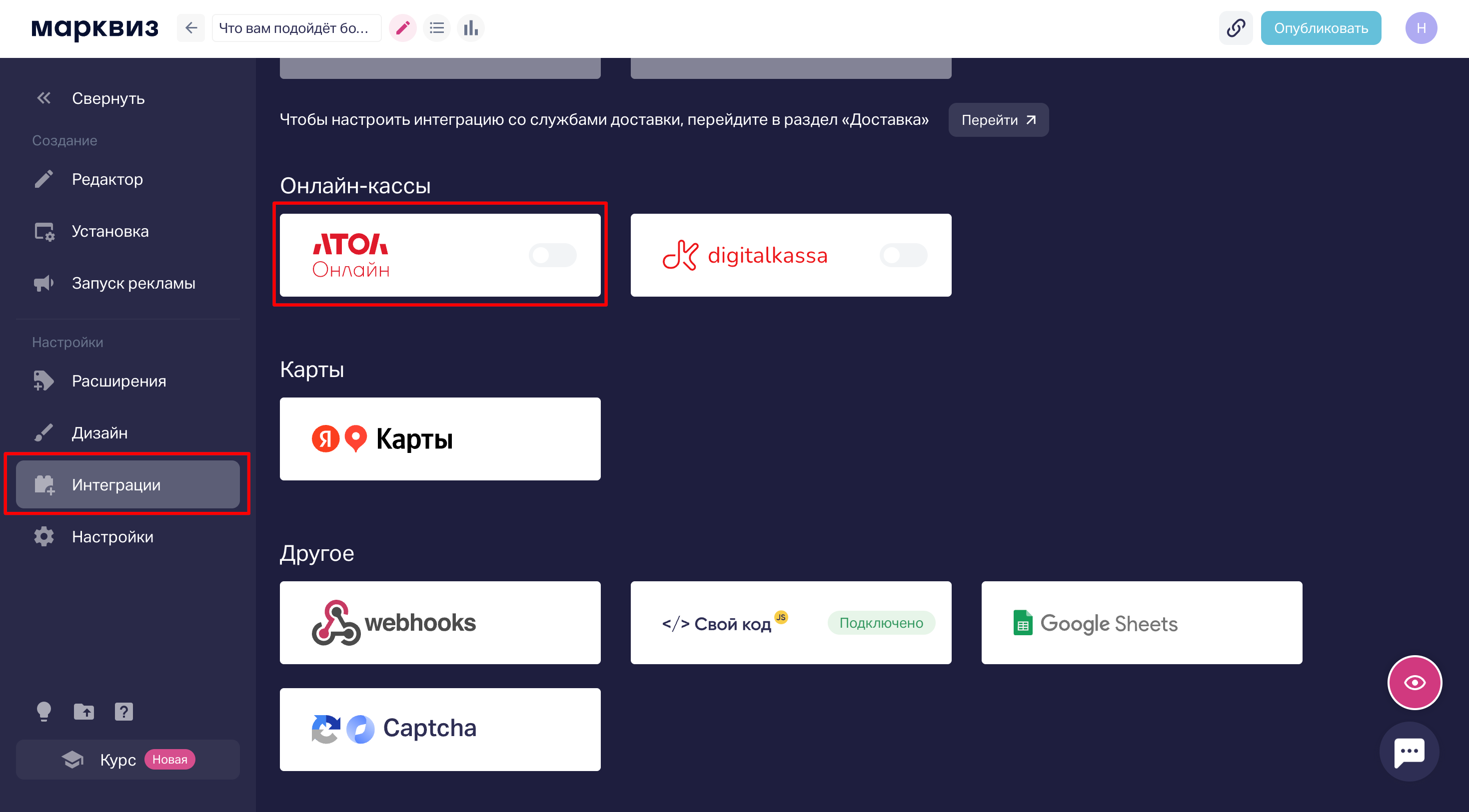 Необходимо перейти в раздел «Интеграции» в редакторе квиза и открыть настройку онлайн-кассы Атол Online.