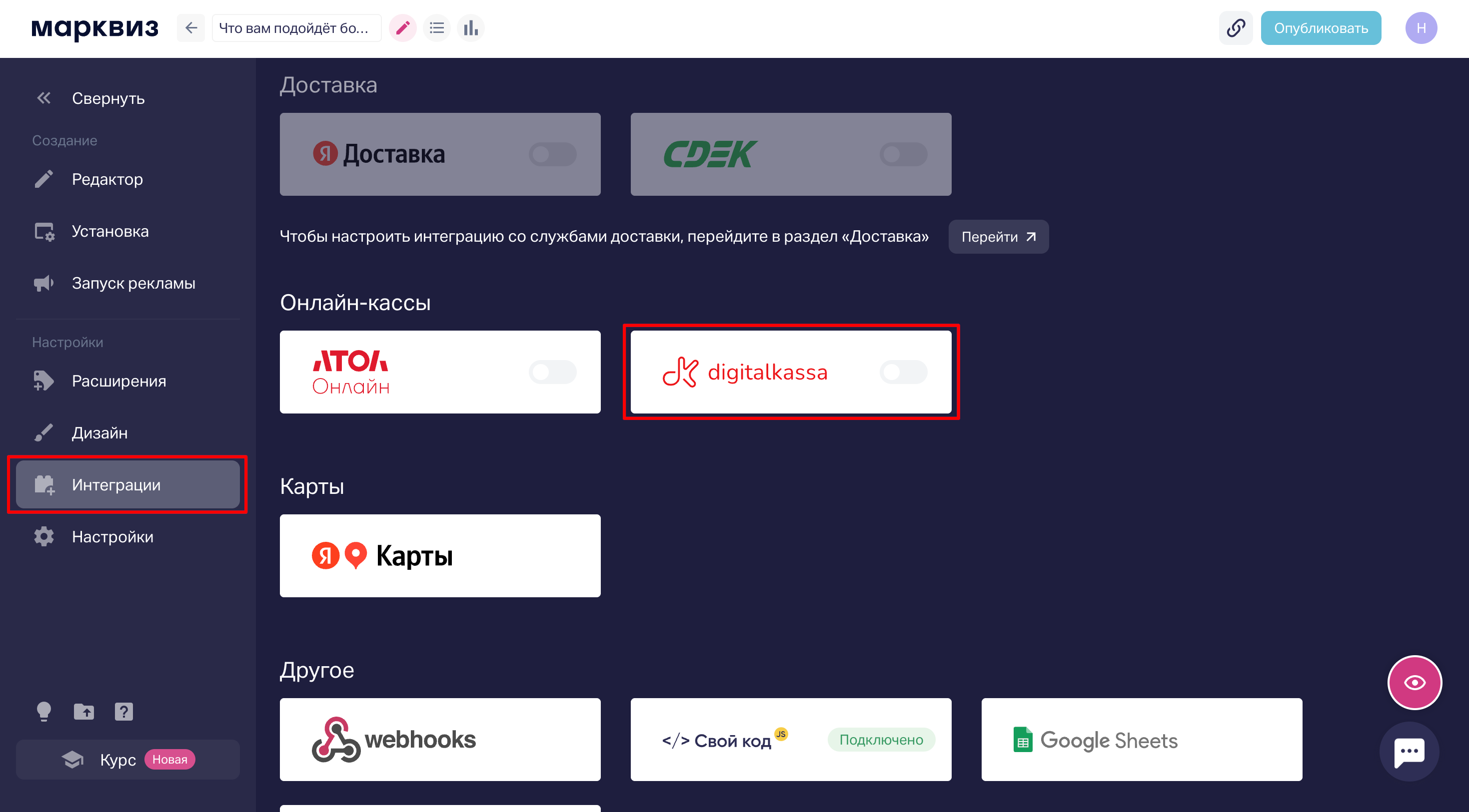 1. Переходим в раздел «Интеграции» в редакторе квиза и открываем настройку онлайн-кассы digitalkassa.