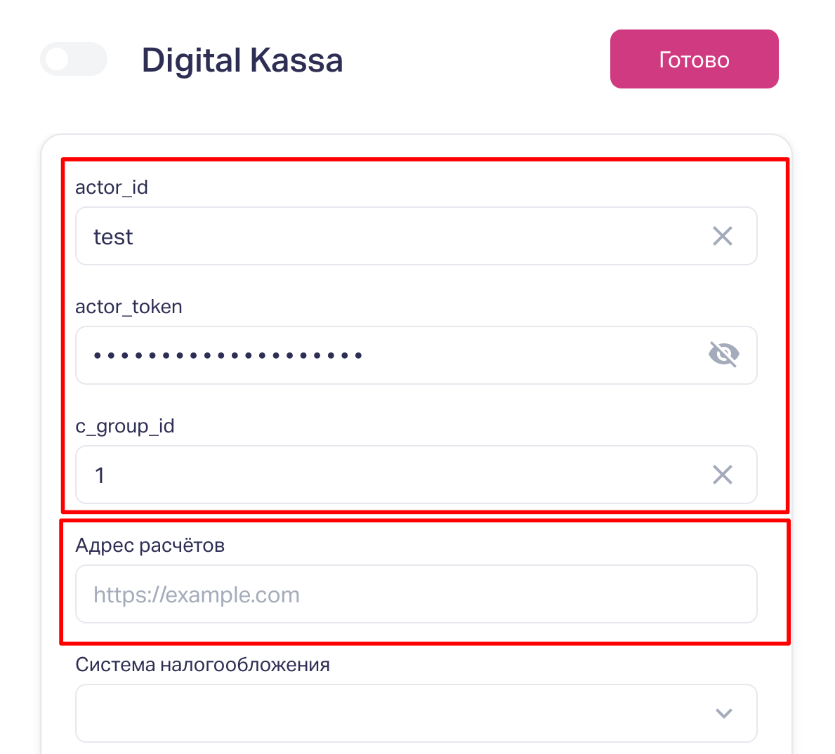 2. Регистрируемся в личном кабинете Digitalkassa, переходим в раздел "API" и копируем ключи — actor_id, actor_token и c_groups.