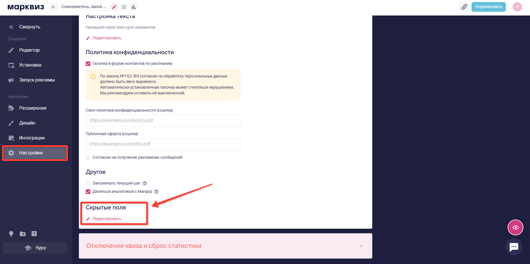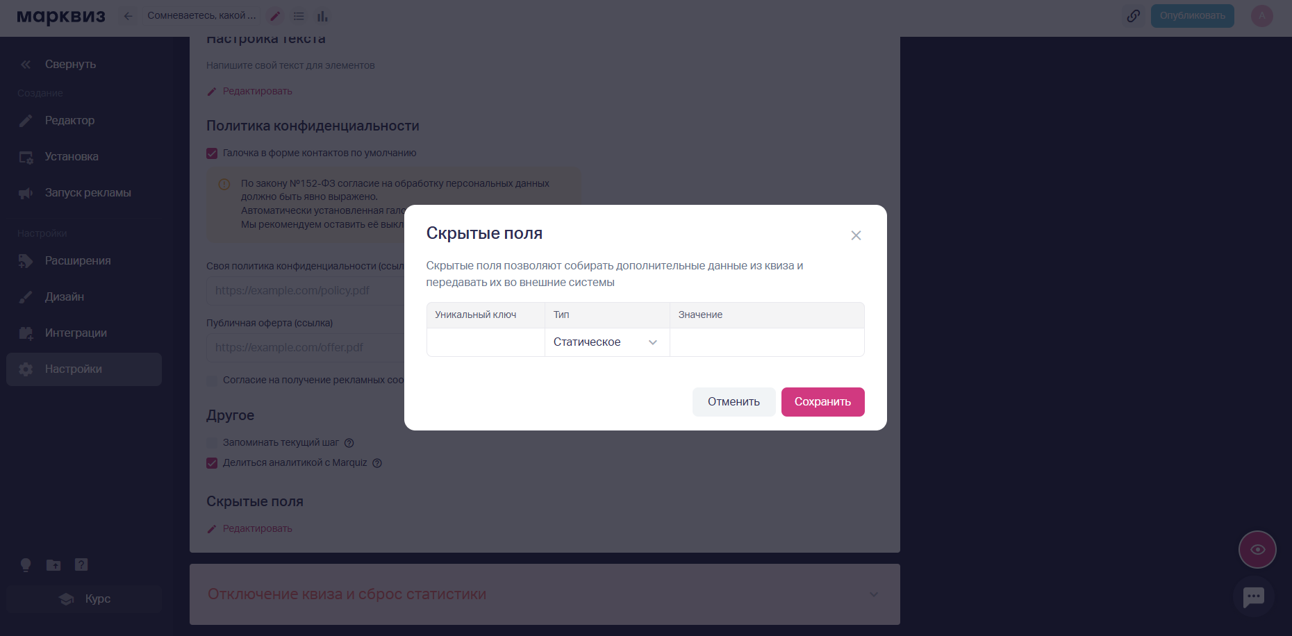 В редакторе квиза нужно перейти в раздел Настройки → блок «Скрытые поля» → нажать «Редактировать». Откроется окно для настройки скрытых полей.