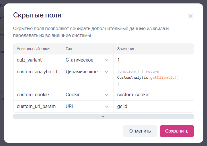 В окне «Скрытые поля» нужно нажать «+», чтобы добавить новую строку. Заполните три колонки таблицы.
