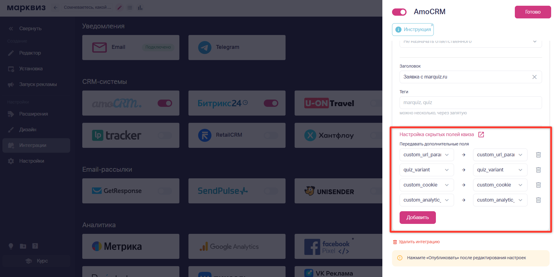 После настройки нужно нажать кнопку «Опубликовать», чтобы изменения в квизе сохранились.