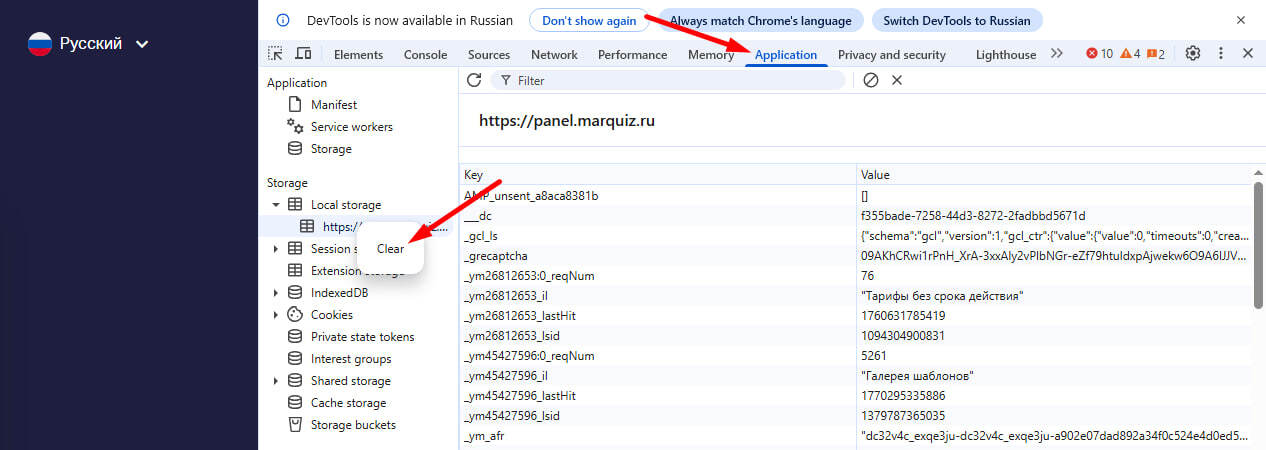 Как очистить локальную память (Local Storage) на сайте marquiz.ru
