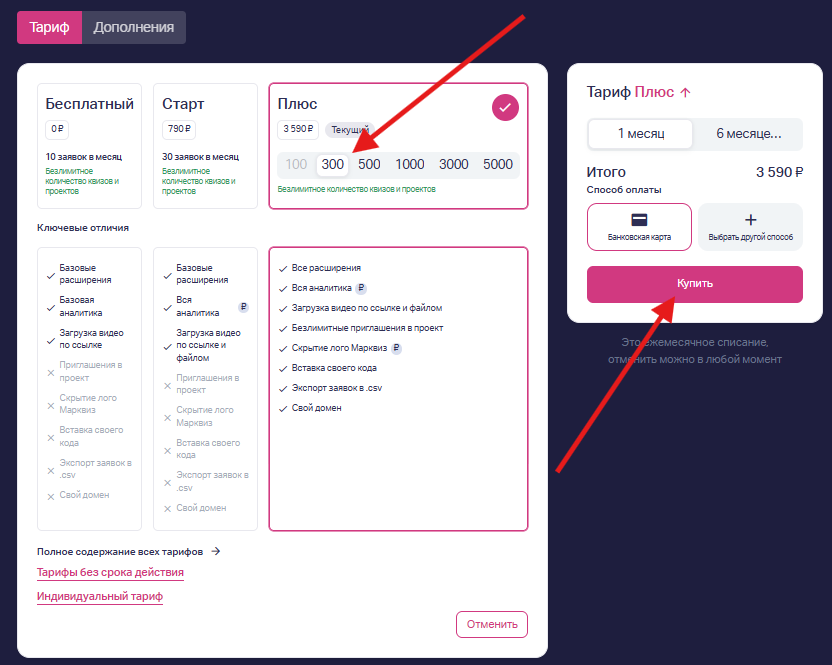 То есть если вы выбираете тариф до 500 заявок на 3 месяца, вы покупаете 1500 заявок со сроком действия 3 месяца