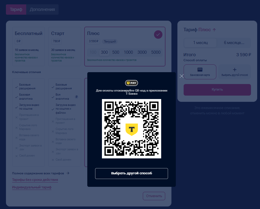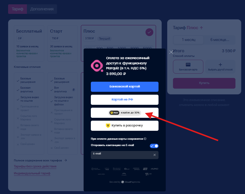 Если вы сомневаетесь в вопросе привязки вашей банковской карты к аккаунту Marquiz, то вы можете завести виртуальную карту ЮMoney или QIWI и привязать её. Пополнять карту можно только на ту сумму, которую планируете затратить за услуги нашего сервиса. Данные карты бесплатные, оформляются в течение двух минут и не имеют комиссии за оплаты в рублях.