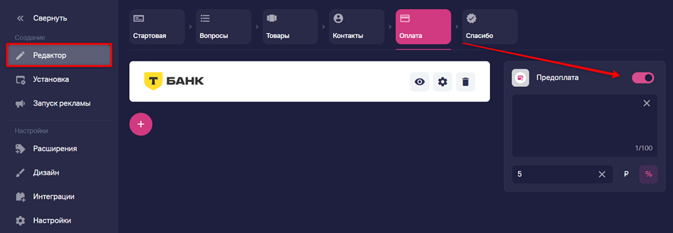 В квизе доступна функция предоплаты, при подключении этой функции у клиента будет возможность внести предоплату за товар или услугу.