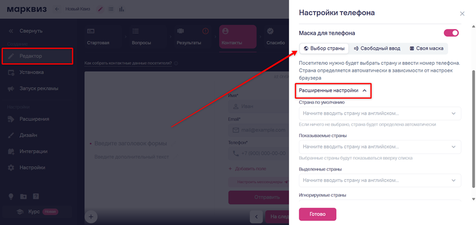 Расширенные настройки выбора страны:
