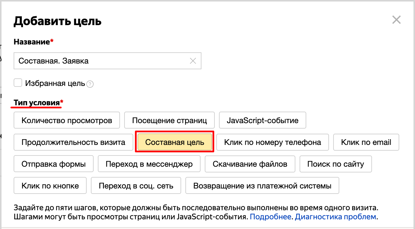 В Метрике можно настроить составную цель, которая будет срабатывать, только если выполнено несколько событий, причем в той последовательности, в которой вы ее настроите. Для того чтобы настроить такую цель, при добавлении нужно выбрать тип условия «Составная»: