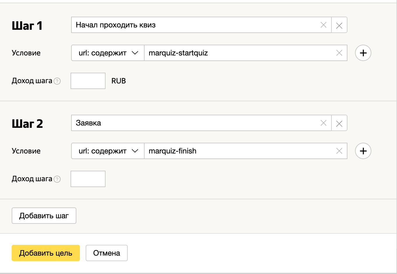 И далее нужно прописать шаги, которые должен выполнить посетитель квиза, настроив цели для этих шагов, например: