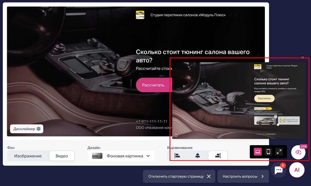 Чтобы сразу смотреть изменения в квизе при редактировании, воспользуйтесь режимом Live Edit. Для этого, нажмите на иконку с глазом в правом нижнем углу.