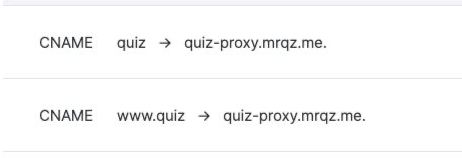Добавляем запись типа A со значением 130.193.59.235 для поддомена или добавляем запись типа CNAME со значением quiz-proxy.mrqz.me. (точка в конце нужна).