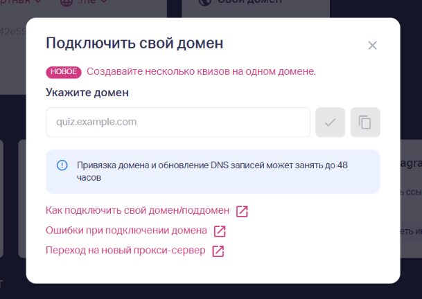 Домен или поддомен подключён к квизу. После обновления DNS квиз будет открываться по указанному адресу. Обновление может занимать до 48 часов.